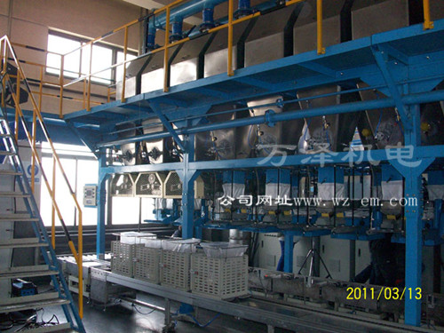 人工將配料袋套與配料筐上,配料筐在升降運(yùn)輸側(cè)輥道、運(yùn)輸定位輥道、電子配料秤、電子校核秤上自動運(yùn)行。配料時,各料筐按工藝配方要求,自動運(yùn)行至相應(yīng)電子配料秤上并定位,自動扣除皮重,加料器便向配料筐內(nèi)加料進(jìn)行計量配料,計量完畢各配料筐自動運(yùn)行至下一工位。